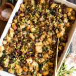 Once the stuffing is all mixed, it simply gets baked off in a standard baking dish. Halfway through cooking, you’ll pull it out and top it with buttery pistachios and dried apricots. This is optional, and if you want to keep it more classic, just omit this step. But, I love the pop of chewy sweetness and rich crunch that those ingredients add.
