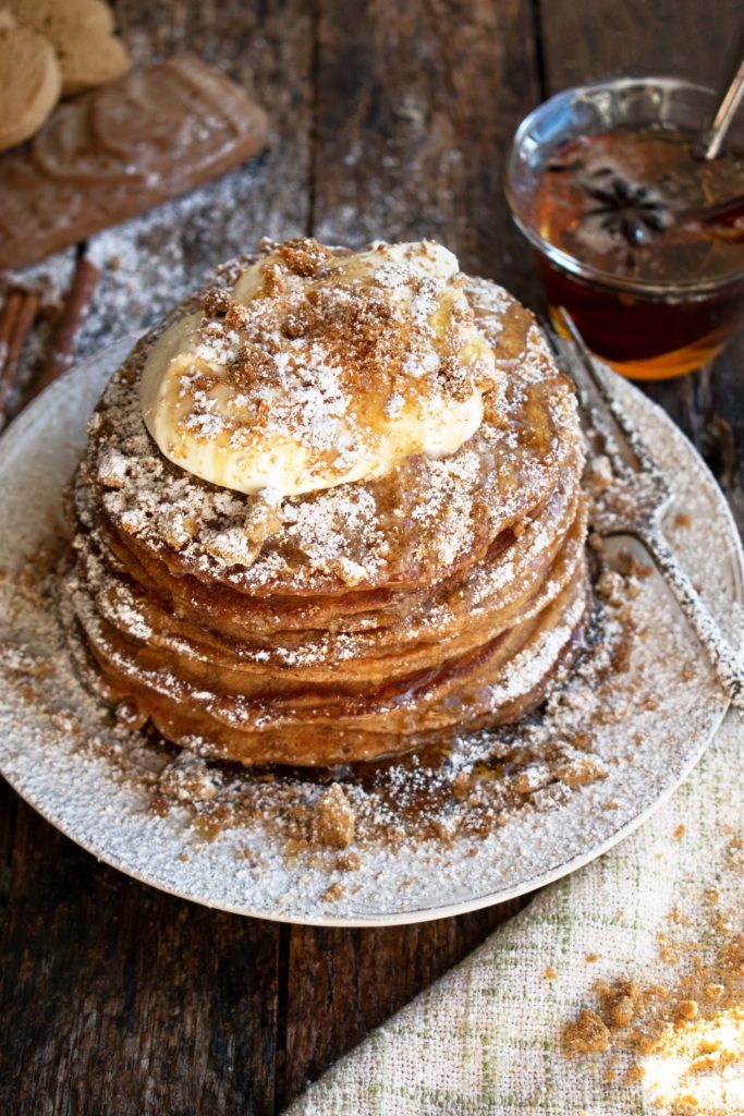 - Keep the pancakes warm while you finish cooking the rest of the batter. Serve the pancakes with the spiced syrup, fresh whipped cream, crushed gingerbread cookies, and a dusting of powdered sugar over top.