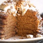 soft gingerbread pancakes flavored with warming spices and brown sugar, drizzled with spiced syrup, and topped with whipped cream