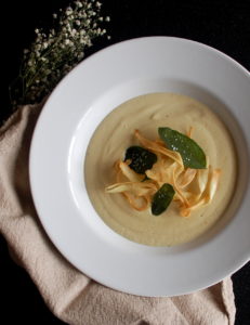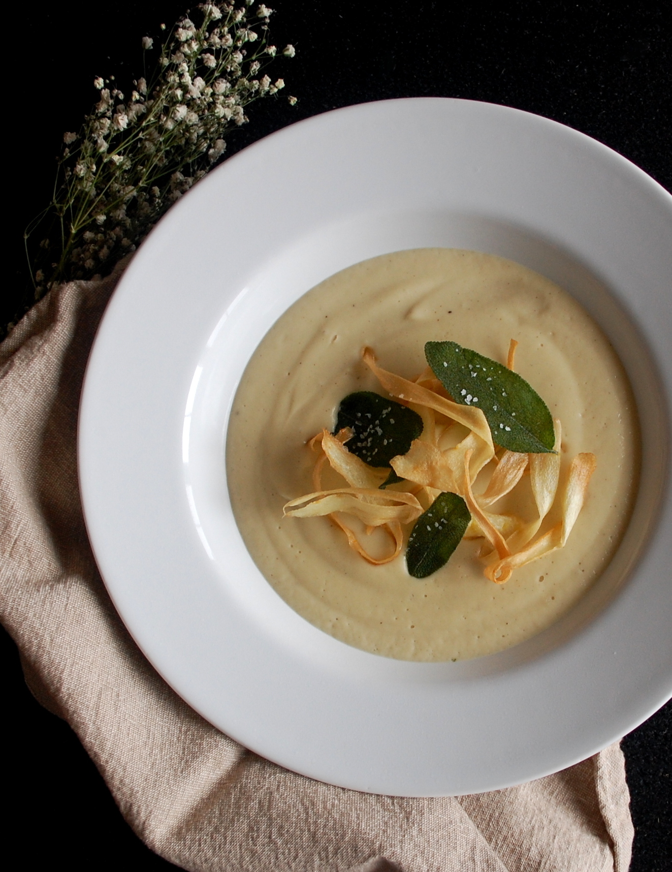 Roasted Garlic Parsnip Soup with Brown Butter Walnuts & Dates