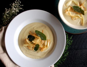 Roasted Garlic Parsnip Soup with Brown Butter Walnuts & Dates