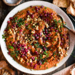 This vibrant roasted red pepper & walnut dip, known as muhammara, makes for the most delicious Christmas appetizer. It has just enough spice and tons of rich flavor. Full of sweet roasted red peppers, toasted walnuts & grainy bread, bright lemon, tangy pomegranate molasses, and bold spices. It gets pulsed up until creamy and topped with pomegranate seeds and chives. Serve it with toasted pita bread for a festive, flavorful start to your meal.