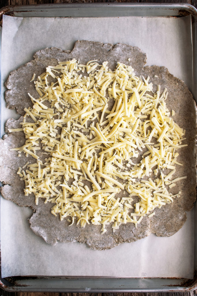 You’ll assemble the crostata by rolling out the dough and then layering on the vegetables along with shredded white cheddar cheese for a little sharp richness. It may seem like a lot of filling, but that’s exactly what we want…a thick bite of cheesy vegetables with a thin layer of bottom crust.