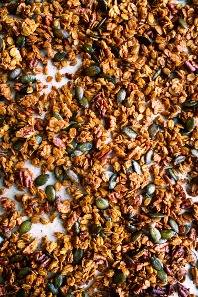 And finally, the savory granola full of crispy oats, pecans, and pumpkin seeds. It’s spiced with cinnamon, nutmeg, paprika, and cayenne, so it has a little kick to it. This granola is such a fun topping for the squash and provides a much needed crunch!