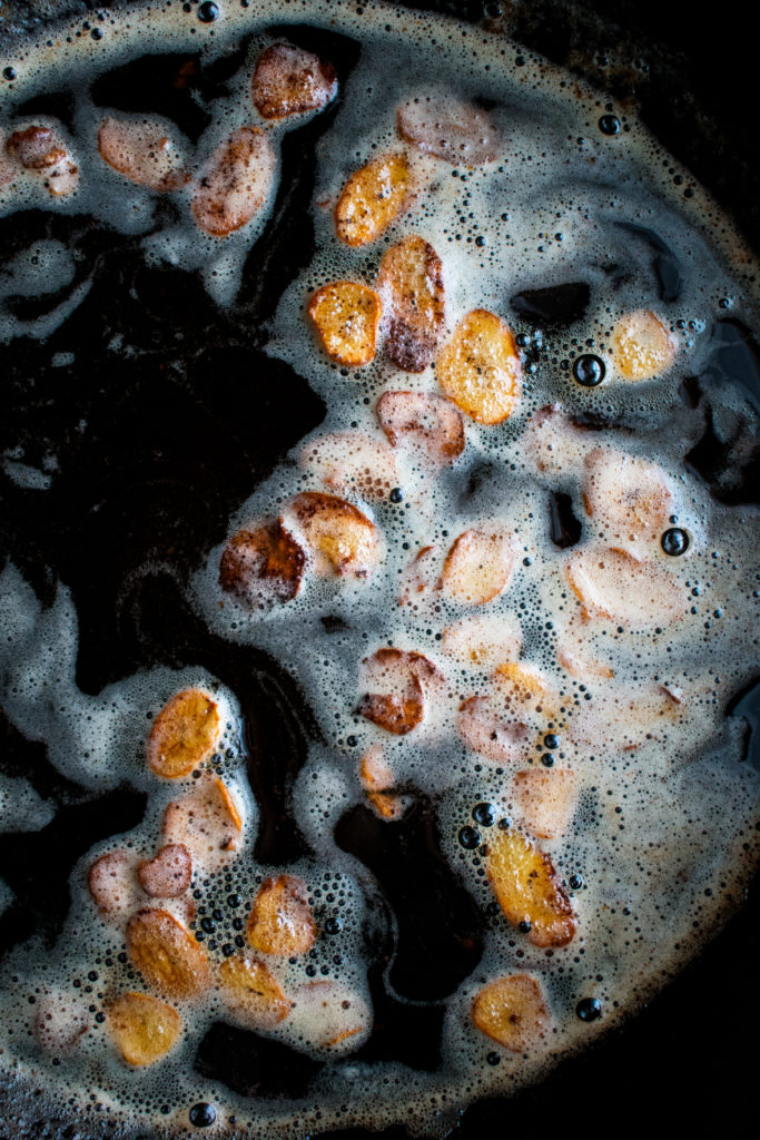 - Transfer the steaks to a cutting board, loosely tent them with foil (allow steam to escape), and rest for 10 minutes. Place the skillet (along with all of the pan juices) onto the stove over medium-low heat. Add the butter and let it melt. Add the sliced garlic in an even layer. Allow the garlic to toast until crisp and the butter to brown, stirring often. Turn off the heat. Use a slotted spoon to transfer the garlic to a plate lined with paper towels. Stir the champagne vinegar and parsley in with the butter. Set aside.