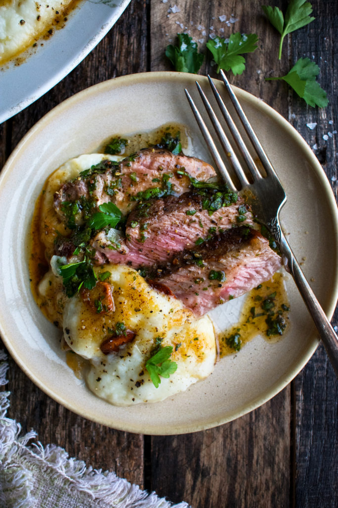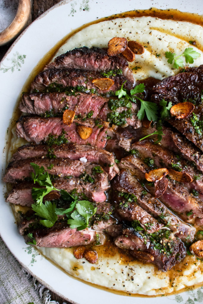 - Slice the steaks against the grain. Spoon the whipped cauliflower onto a large platter and arrange the steak over top. Drizzle everything with the brown butter sauce. Garnish with the toasted garlic, a pinch of flaky sea salt, and extra parsley leaves.