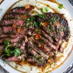Slice the steaks against the grain. Spoon the whipped cauliflower onto a large platter and arrange the steak over top. Drizzle everything with the brown butter sauce. Garnish with the toasted garlic, a pinch of flaky sea salt, and extra parsley leaves.