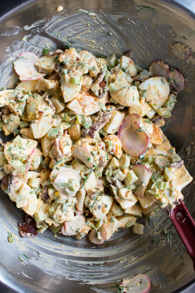 - Combine the mayonnaise, dijon mustard, lemon zest, lemon juice, garlic, paprika, coriander, and cayenne pepper in a large mixing bowl. Whisk to combine. Fold in the eggs, celery, green onions, radishes, dill, and chives.