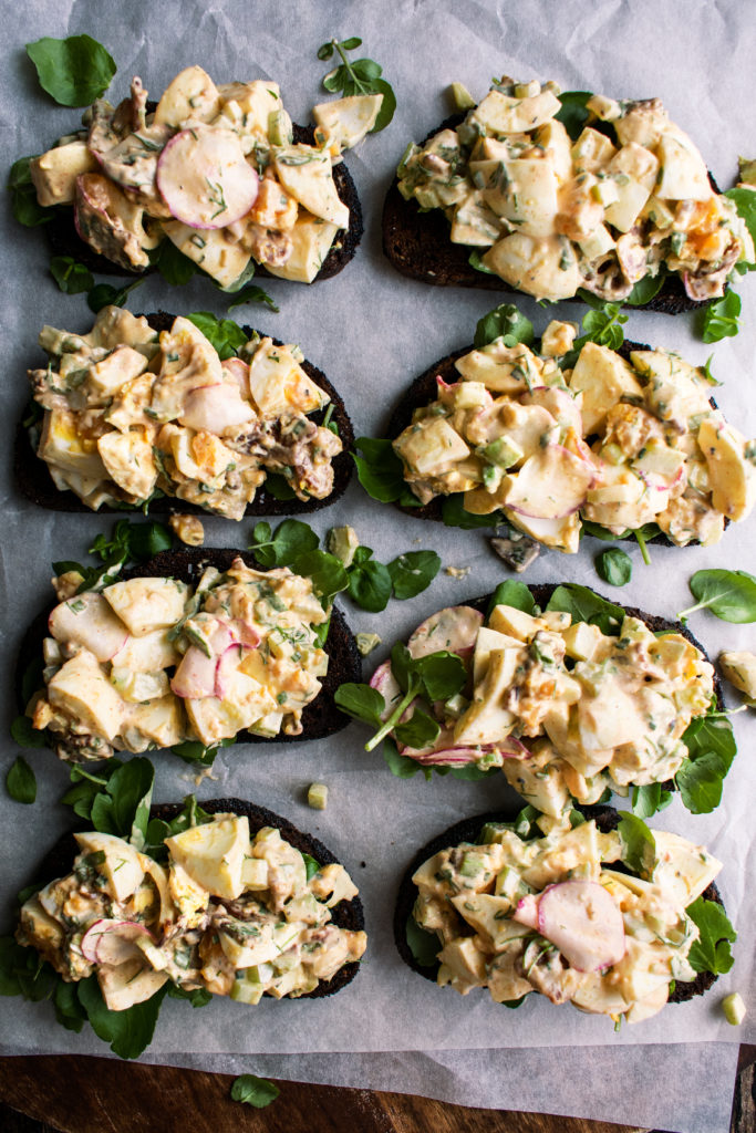 The tastiest bacon & egg salad on rye toast with plenty of fresh spring ingredients! Full of classic flavor, a creamy dressing, lots of herbs, and a rich bite from the crispy bacon. It comes together easily and is spooned on top of toasted rye bread with a little bit of watercress for some green. Whip this up as a breakfast, lunch, or serve it for any spring brunch!