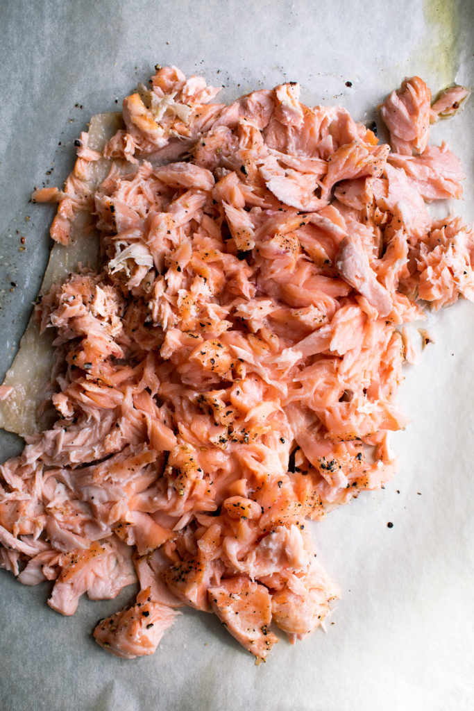 - Preheat the oven to 375°F. Place the whole salmon filet, skin side down, on a parchment-lined sheet pan. Drizzle with olive oil and season with a pinch of salt. Roast the fish for 10 minutes (the salmon should be just par-cooked so that when you cook it again for the salmon cakes it won’t be dry). Let cool slightly. Use two forks to flake apart the salmon meat. Discard the skin and set aside.