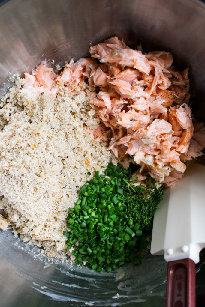 The rest of the salmon cake mixture is really simply to throw together. I’m using fresh rye breadcrumbs and a bit of Greek yogurt to keep the texture extra rich and tender. Plus, the rye bread gives such a nice flavor. Dijon mustard, grated garlic, cayenne pepper, and plenty of fresh dill & chives are added in, with a couple eggs binding everything together.