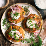 PrintRye Salmon Cakes with Yogurt Sauce & Pickled Shallots
