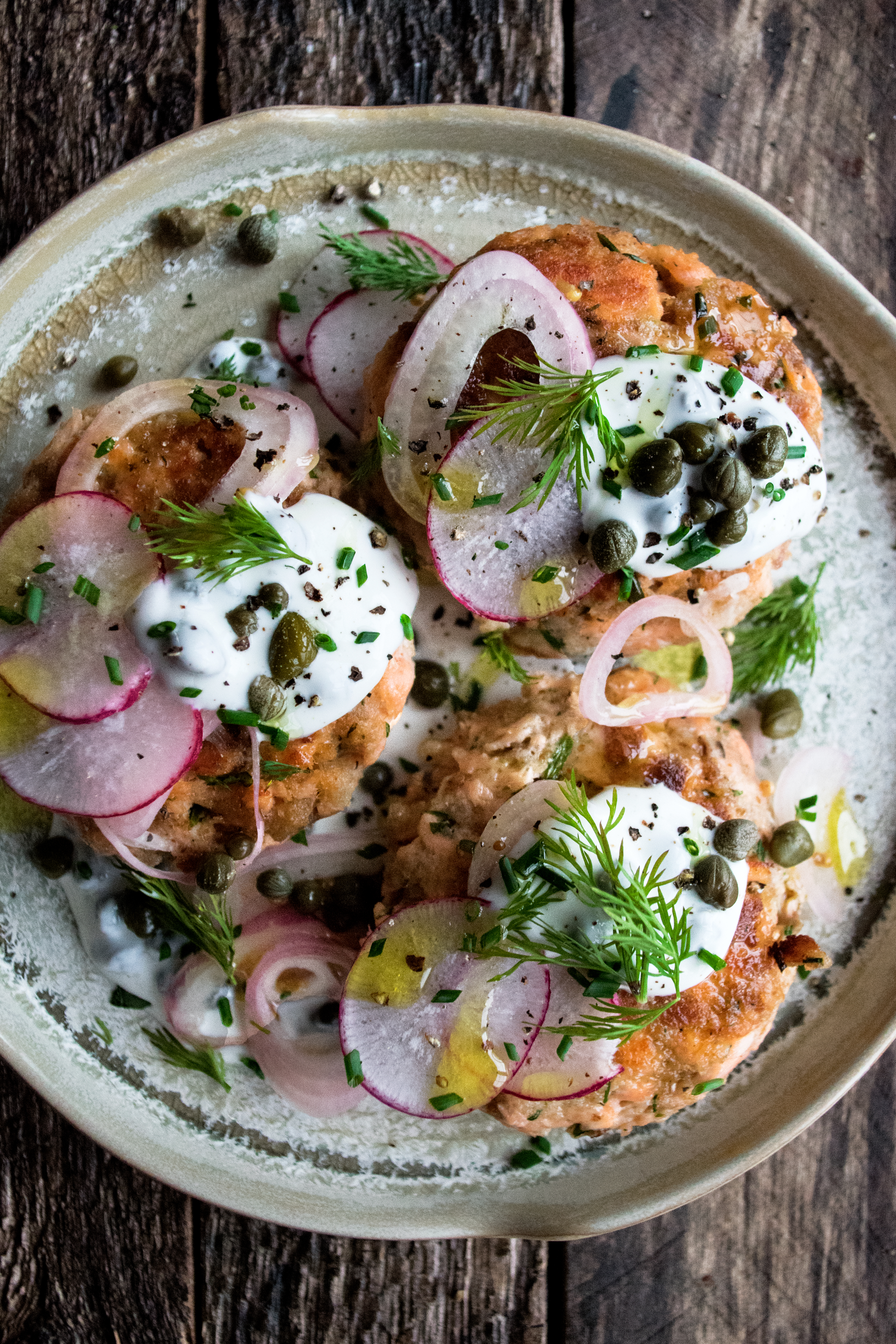 Rye Salmon Cakes with Yogurt Sauce & Pickled Shallots