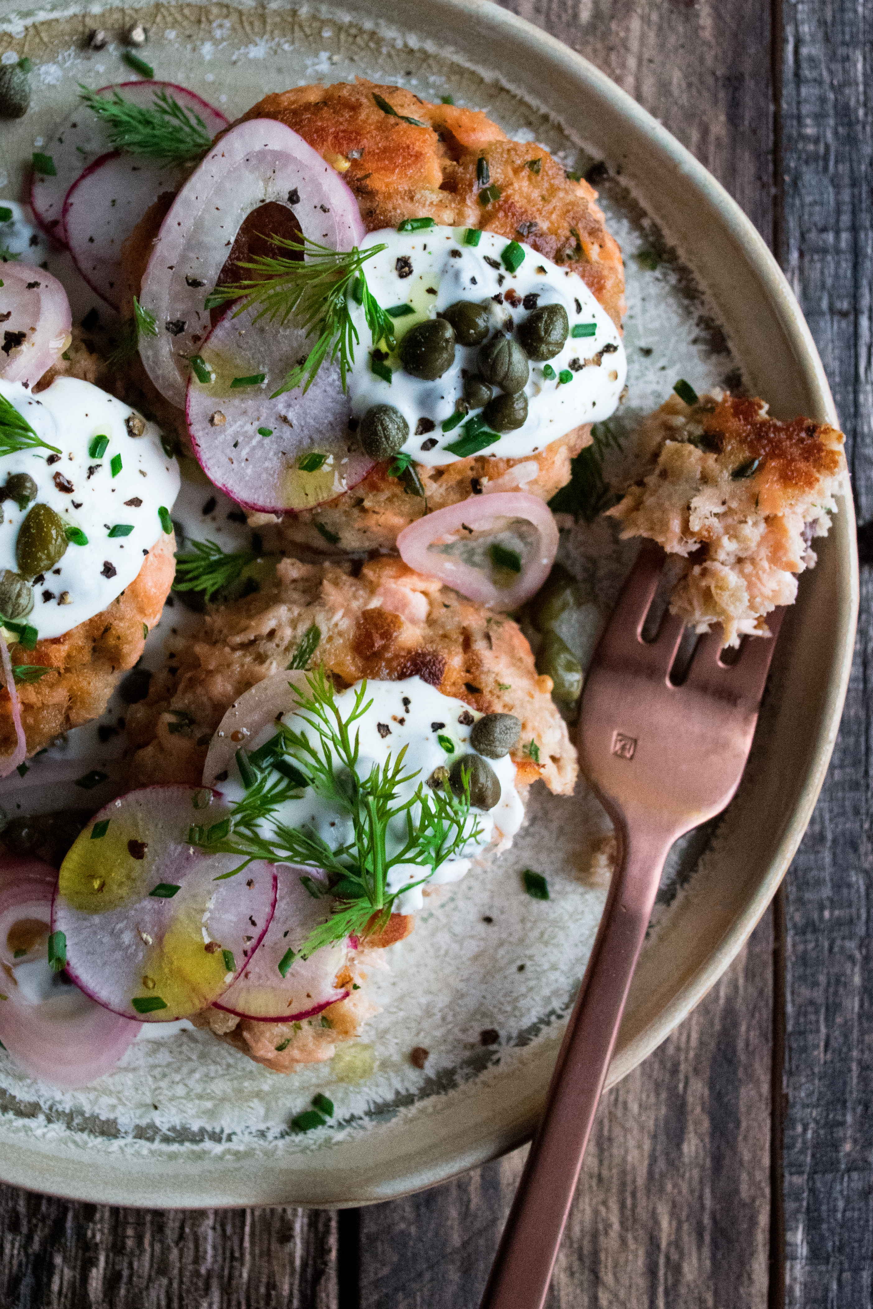 Rye Salmon Cakes with Yogurt Sauce & Pickled Shallots