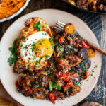A roasted potato & sausage hash full of juicy summer cherry tomatoes, tossed with spicy tomato butter, and topped with slightly crispy fried eggs. It’s an indulgent savory breakfast dish that’s full of zesty flavor and bold heat.