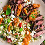 Garlic-marinated skirt steak grilled until charred & juicy. Served with a simple orzo salad full of crunchy and vibrant mediterranean-inspired ingredients. And the finishing touch is a tangy, smoky red pepper sauce to spoon over top.
