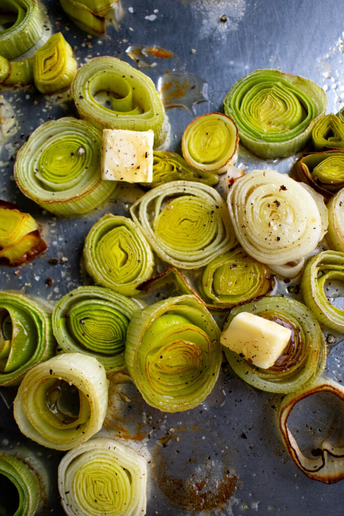 - Place the leeks onto a sheet pan and drizzle generously with olive oil. Toss to coat and spread them into an even layer. Season well with salt and black pepper. Roast for 25 minutes. Add the pieces of butter to the pan and drizzle the honey over the leeks. Roast for another 5 minutes, or until tender and caramelized.