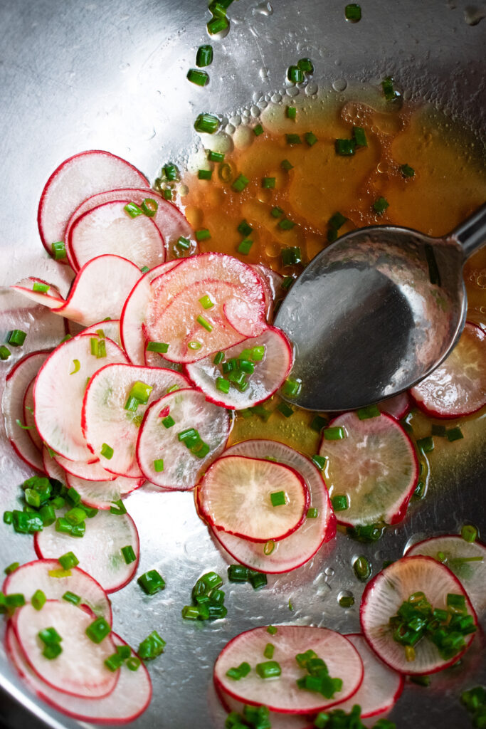 There isn’t really a dressing for this salad…I just tossed some radishes and chives with a splash of red wine vinegar and olive oil for something bright and tangy to spoon over top.