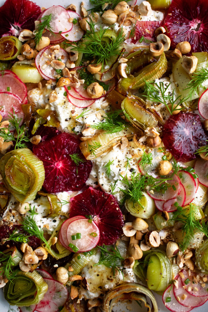 a winter salad of butter roasted leeks, blood oranges, burrata cheese, radishes, roasted hazelnuts, and fresh herbs