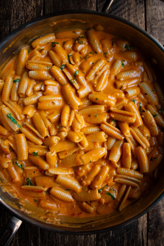 You’ll start by cooking shallots and garlic in butter until soft and caramelized. Fennel seeds, tomato paste, and the calabrian chili peppers go in next, giving the sauce plenty of flavor. Heavy cream and starchy water simmer with those ingredients for just a couple of minutes before the cavatelli pasta is added in.