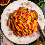 I recently picked up a jar of calabrian chili peppers and immediately wanted a big bowl of spicy, creamy pasta. These chiles are grown in the Italian region of Calabria. They’re packed with heat and give a robust, bold spiciness to any dish.