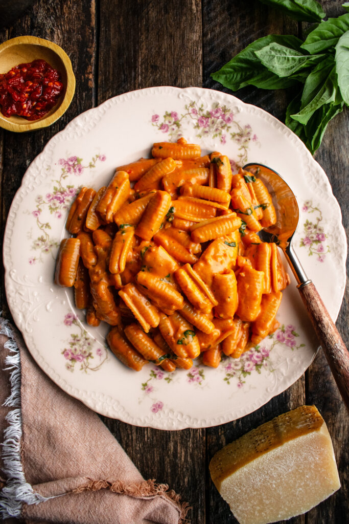 This creamy basil & calabrian chili cavatelli is a spicy plate of pasta goodness. Pillowy cavatelli pasta tossed in a silky-smooth sauce that’s full of rich flavor. The sauce comes together effortlessly and is ready by the time the cavatelli is done boiling. This is one of those pasta dishes that you’ll be making over and over again.