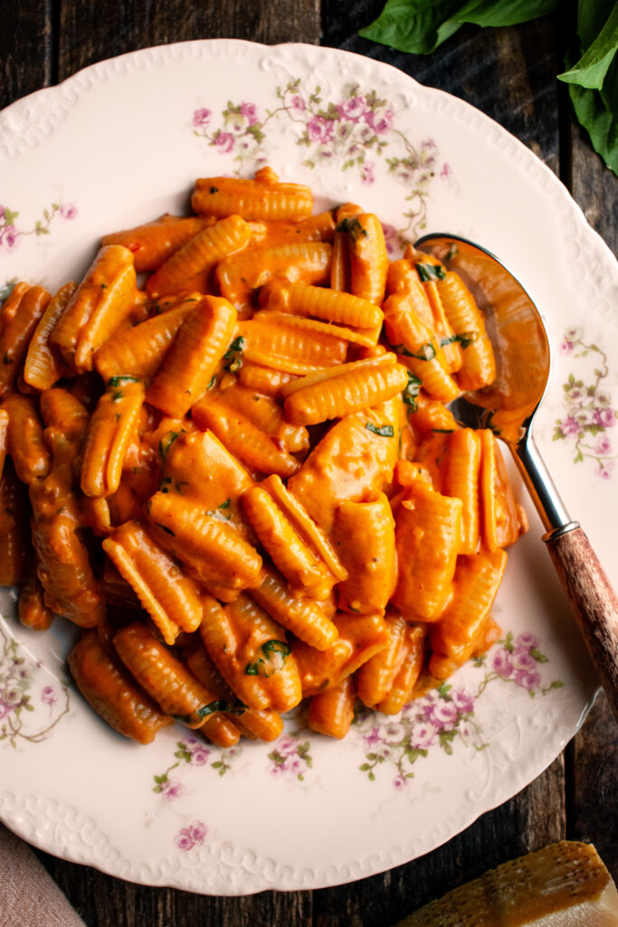 cavatelli pasta tossed in a creamy basil & calabrian chili tomato sauce