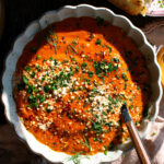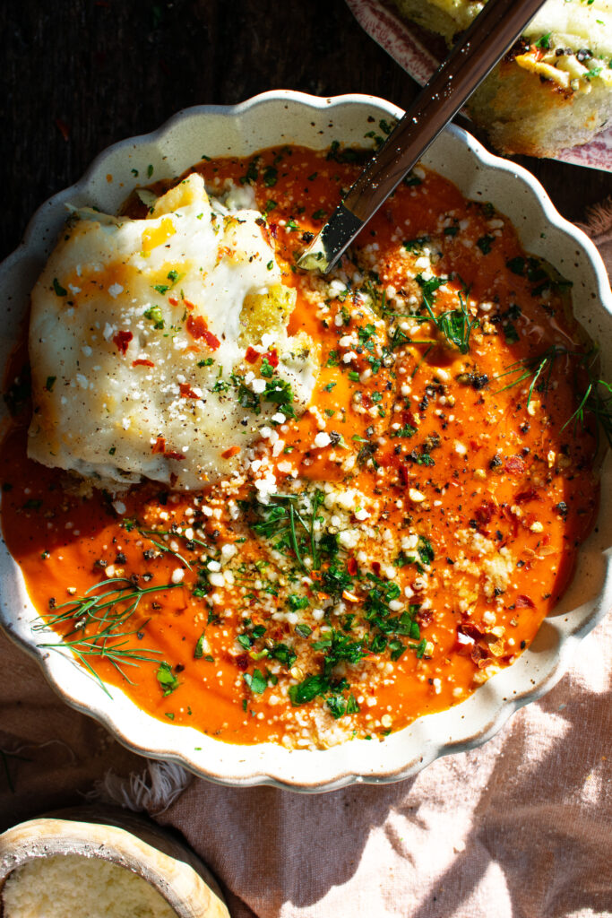 A comforting bowl of spicy tomato soup with cheesy, herby garlic bread. The soup is creamy, comforting, full of bold flavor, and made even better when soaked up by the bread. It’s the perfect tomato soup to make all winter long.