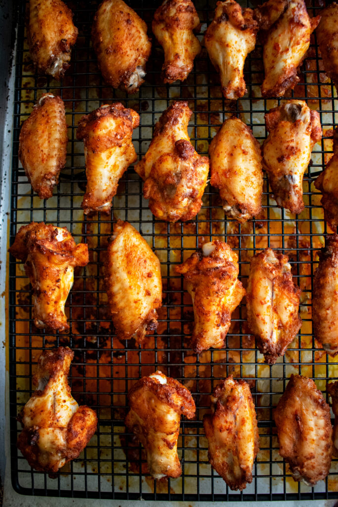 - Preheat the oven to 450°F. Prepare a parchment-lined half sheet pan with a baking rack over top. Place the wings onto the rack in an even layer.