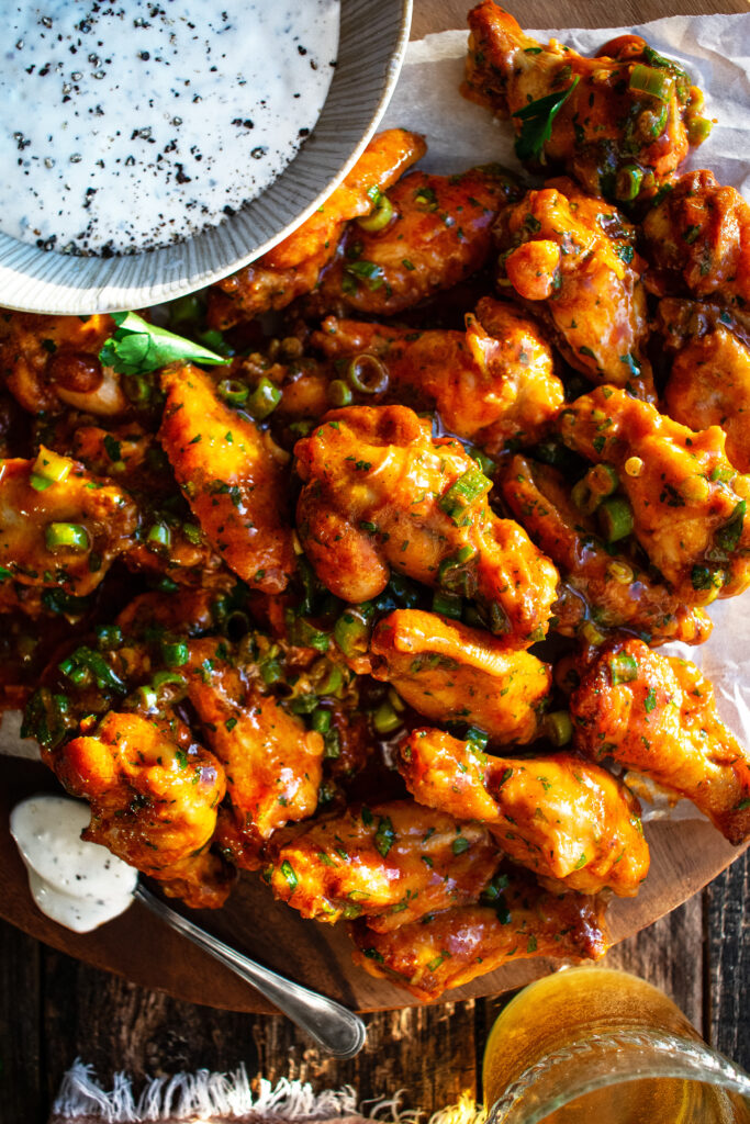 - When the wings come out of the oven, toss them with the buffalo sauce, green onions, and parsley. Serve immediately, with an extra drizzle of honey over top and a bowl of ranch or blue cheese dressing alongside for dipping.