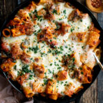 A cheesy baked rigatoni with Italian sausage, burst cherry tomatoes, fresh spinach, garlicky marinara sauce, and lots of melted mozzarella. It’s baked until golden & bubbling, then topped with fresh parsley and parmesan. This is one of my favorite easy dinners for any night of the week, and the recipe has a bit of family history to it as well!