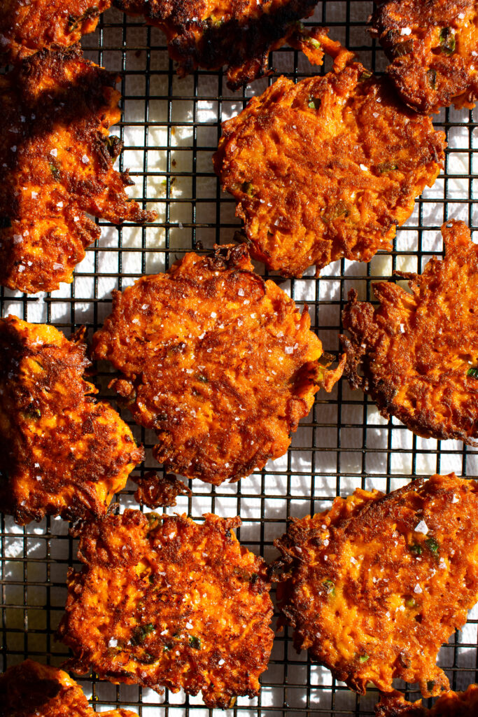 These sweet potato fritters get pan-fried in a shallow layer of hot oil until golden brown and crisp, yet soft on the inside. The key is to watch the heat and adjust as needed. Once they’re done, you’ll want to season them with a pinch of flaky sea salt for one last pop of flavor.