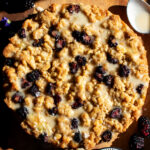 Add the dry ingredients and mix on low until just incorporated. Fold in the zucchini and ¾ of the blackberries using a rubber spatula. Spread the batter into the cake pan. Top the cake with the streusel and remaining blackberries.