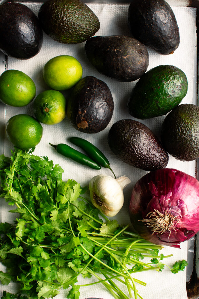 A great guacamole starts with great avocados. You’ll want to find ripe avocados – soft enough to mash up easily, yet still vibrantly green with minimal brown spots.