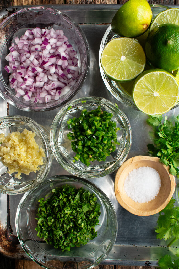 The rest of the guacamole ingredients are traditional – red onion for a sharp onion bite, jalapeños for heat, garlic for flavor, cilantro for freshness, and lime juice for acidity.