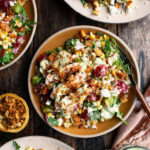 Savoring the last bit of summer with this grilled chicken & corn salad! It’s a vibrant, extremely delicious salad full of different flavors and textures. There’s peppery arugula, the grilled chicken & corn, sweet cherry tomatoes, salty olives, red onion, crumbled feta cheese, roasted pistachios, and a creamy dill dressing. Topped with crispy breadcrumbs, this is definitely a special salad to celebrate the end of the season.