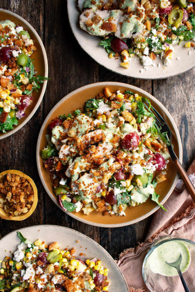 a summer salad with arugula, grilled chicken & corn, cherry tomatoes, olives, red onion, feta cheese, pistachios, a creamy dill dressing, and crispy breadcrumbs