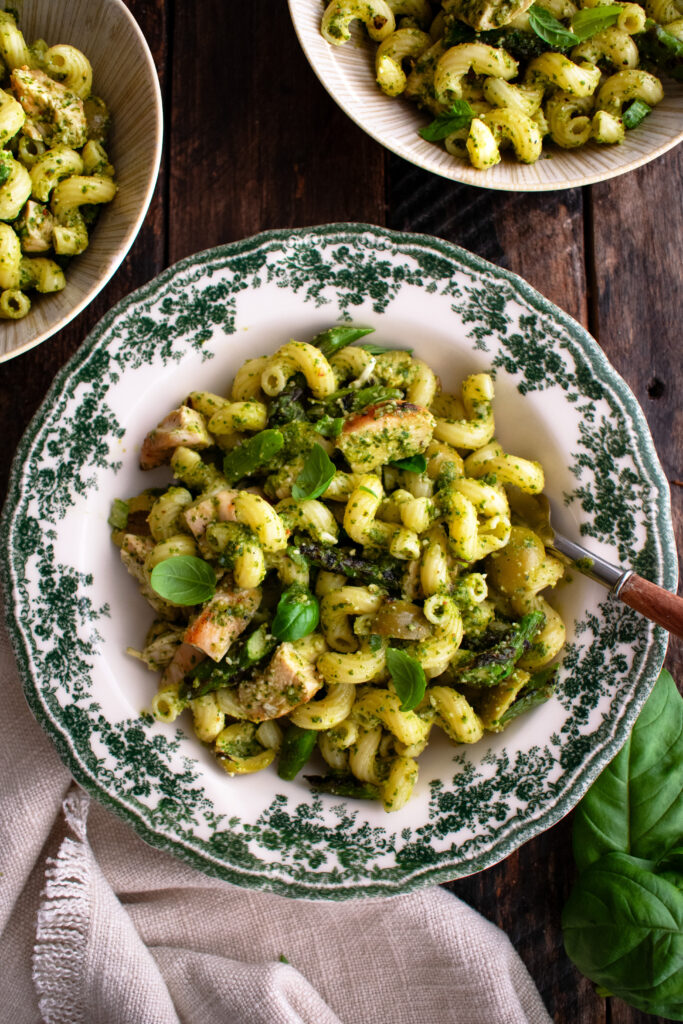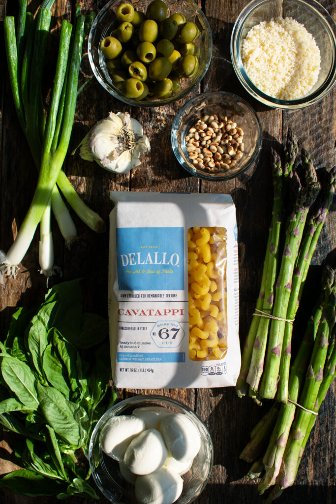 A vibrant pesto pasta salad recipe for the summer season! Cavatappi pasta tossed with grilled chicken, slightly charred asparagus & green onions, fresh mozzarella, castelvetrano olives, and a basil pesto dressing. It’s a fresh, seasonal recipe that works great for all of your summertime cookouts.