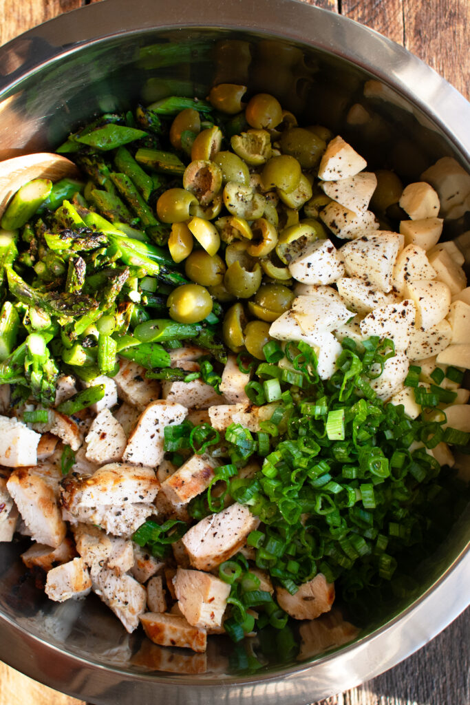 - Combine the pasta, chicken, asparagus, green onions, fresh mozzarella, olives, and pesto in a large bowl. Toss well to combine. Serve at room temperature. Top with more grated parmesan if desired.