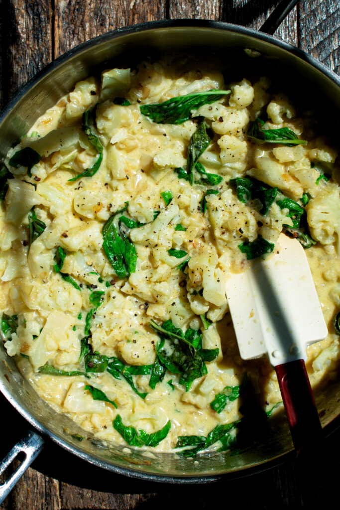 - Add the cauliflower florets, heavy cream, and a few cracks of black pepper. Stir well and bring the cream to a simmer. Reduce the heat to medium-low and cover the skillet. Gently simmer for about 20 minutes, or until the cauliflower is tender.