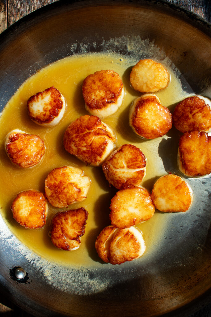 - Wipe out the skillet and return it to medium-high heat. Add enough neutral oil to coat the bottom of the skillet. Once hot, place half of the scallops into the skillet. Cook, undisturbed, for 3-4 minutes until a golden crust forms. Flip the scallops and cook for just another minute or so. Transfer them to a plate and repeat with the remaining scallops.