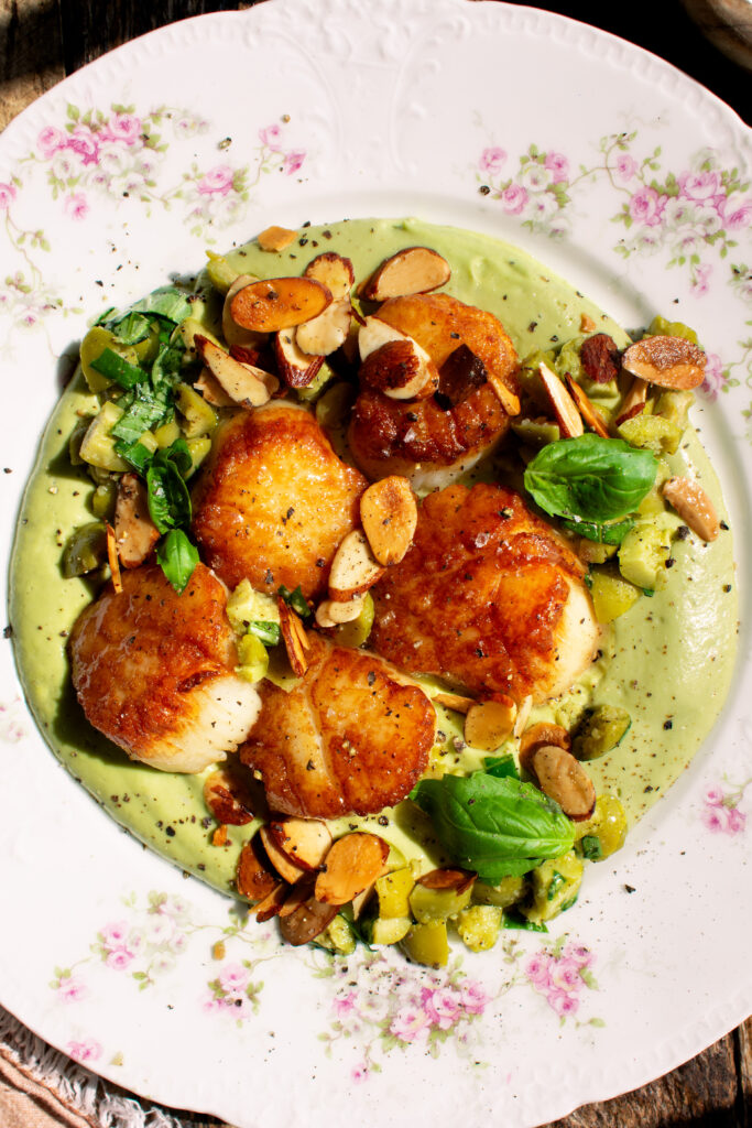 A plate of seared scallops over whipped cauliflower with a really simple olive topping and butter toasted almonds. Just as flavorful as it is beautiful, it’s a great dish to serve at your next dinner party!