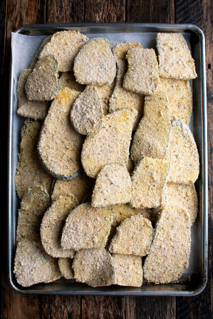 - Dredge each slice of eggplant through the flour, eggs, and then breadcrumbs. Gently lay the slices onto the sheet pan as you go.
