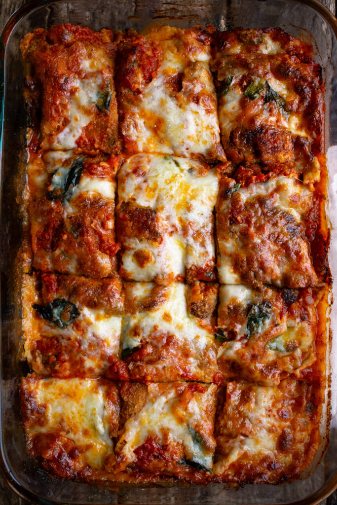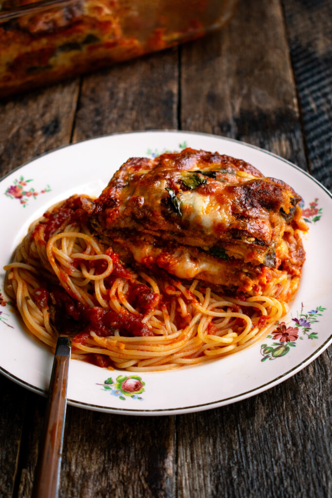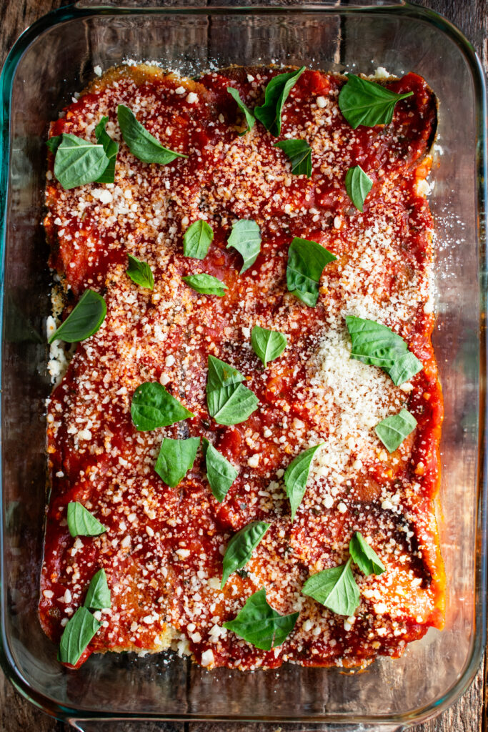 I stacked each layer four times in a deep baking dish, which gave the finished product lots of height and great texture. You’ll first bake it covered in foil so that everything can heat through and the cheese can fully melt. And then I like to finish it under the broiler to brown the top.