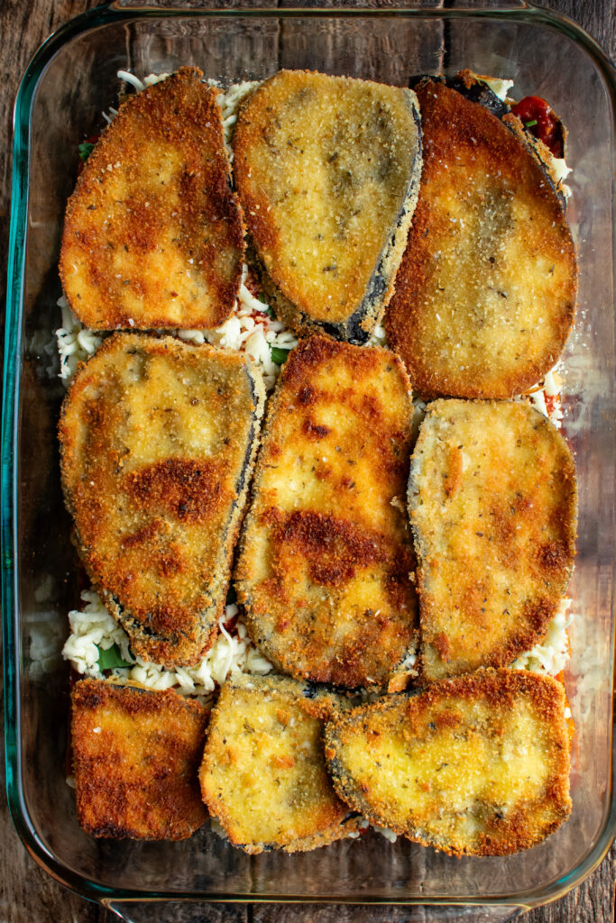 eggplant parmesan baked until the cheese is melted & bubbling, with layers of tomato sauce, slices of fried eggplant, mozzarella, parmesan, and fresh basil