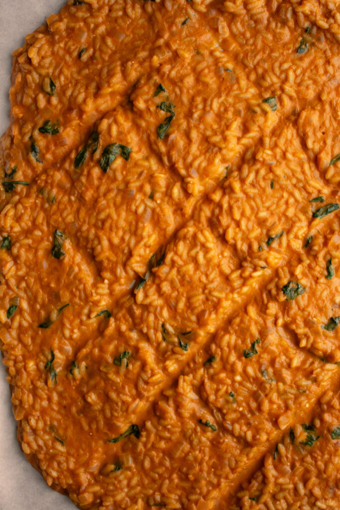 - Stir in the remaining 2 tablespoons of butter, parmesan, basil, and lemon zest. Turn off the heat and stir until incorporated. Pour the risotto onto a sheet pan lined with parchment paper. Spread it into an even layer. Chill for 1 hour.