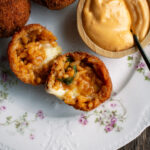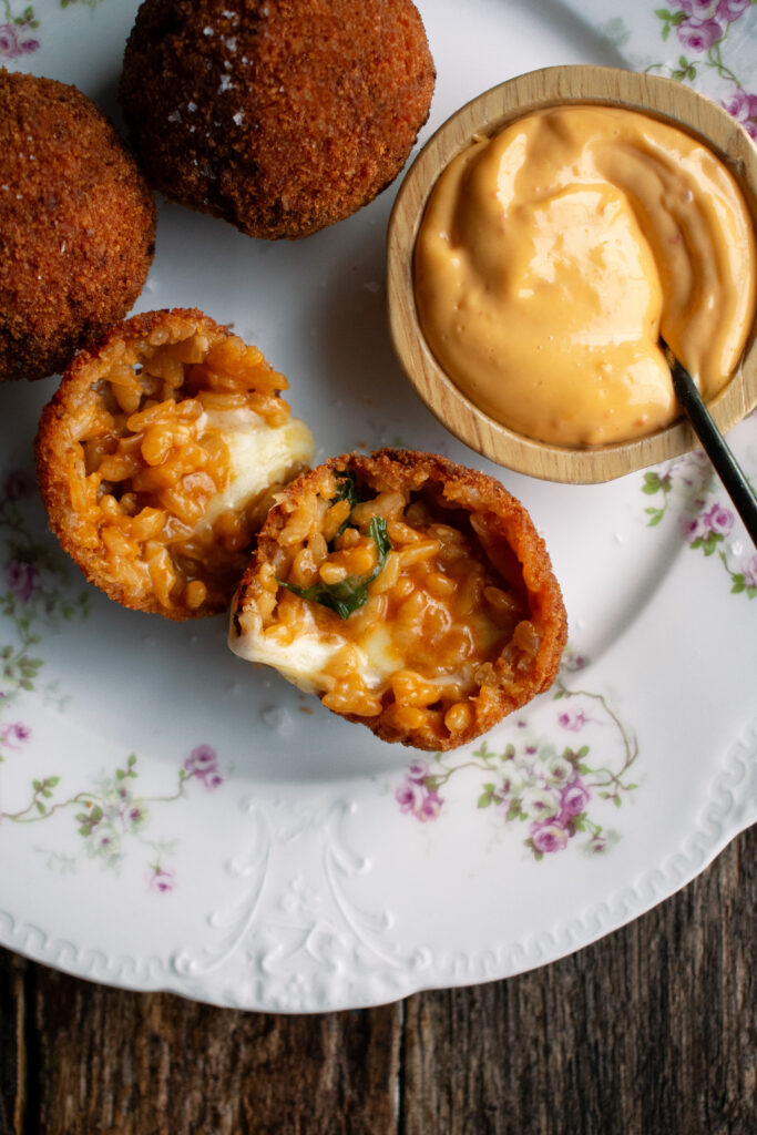 A celebratory dish to ring in the new year: arancini with calabrian chili aioli. Arancini are fried balls of risotto, a classic Italian appetizer. This risotto is flavored with tomato, basil, and parmesan cheese. It’s stuffed with mozzarella, rolled into balls, and fried until golden. Served with the spicy aioli for dipping!