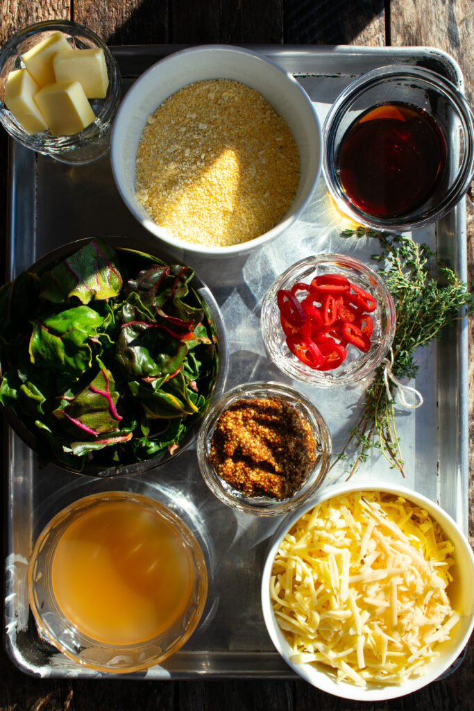 The polenta is flavored simply with fresh thyme as it cooks and finished with lots of cheddar cheese. A little butter adds a silkiness right at the end. Polenta hardens quickly as it cools, so once you take it off the heat, try to serve it as soon as possible in order to keep it creamy.