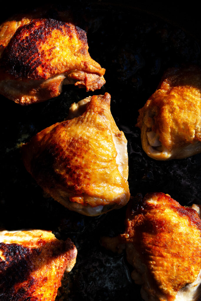 To cook the chicken, I’m using my standard method for bone-in, skin-on chicken thighs – crisping the skin in a hot skillet until crisp & golden, flipping the chicken thighs over, and then finishing them in the oven.