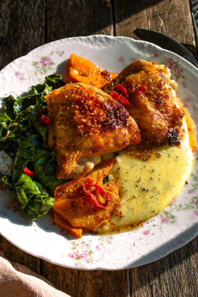 pan-roasted chicken thighs glazed in a spicy maple mustard sauce and served over creamy white cheddar polenta with butternut squash & wilted greens